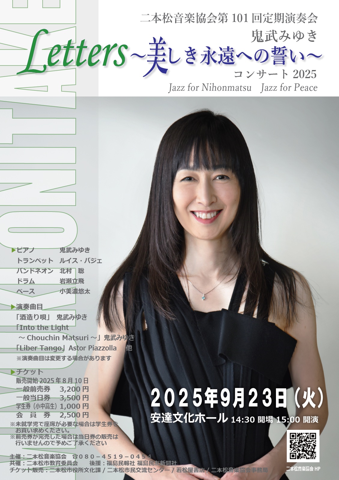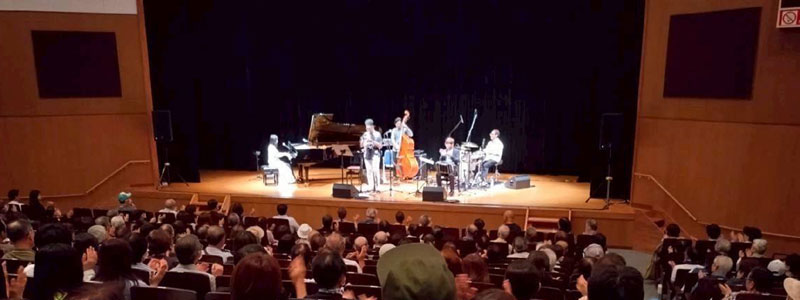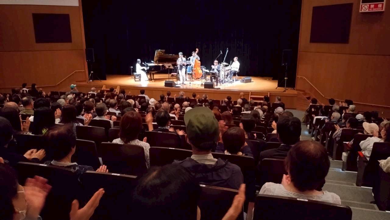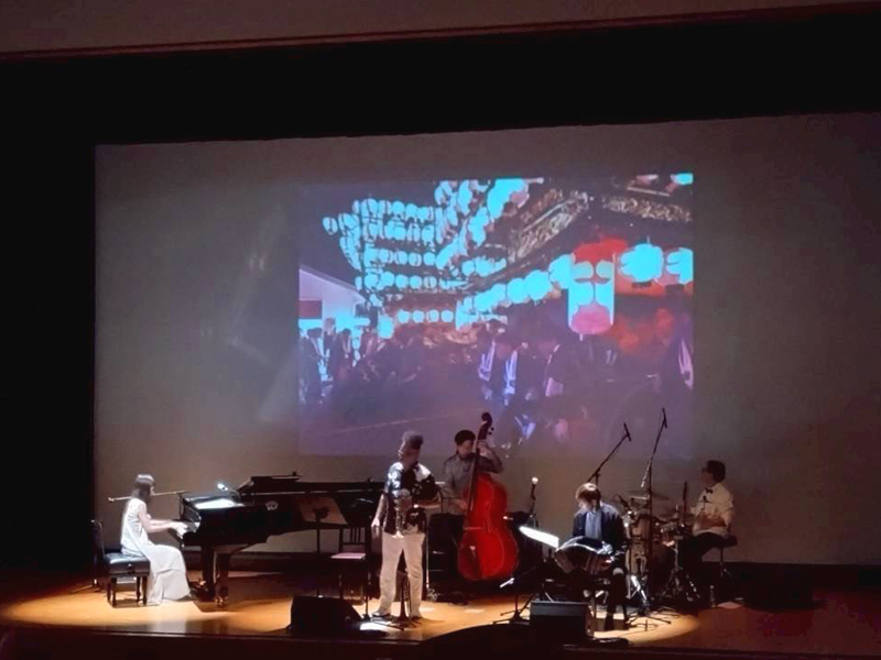 ピアニストの鬼武みゆきさんが、世界、日本各地、そして福島県内を旅して紡ぎだした曲の数々を、トランペットのルイス・バジェさん、バンドネオンの北村聡さん、ドラムの岩瀬立飛さん、ウッドベースの小美濃悠太さんとともに時に優しく、時に力強く、時に軽快に演奏し会場を魅了しました。